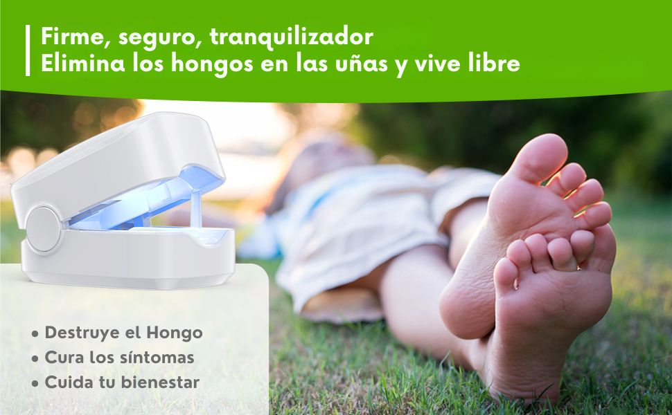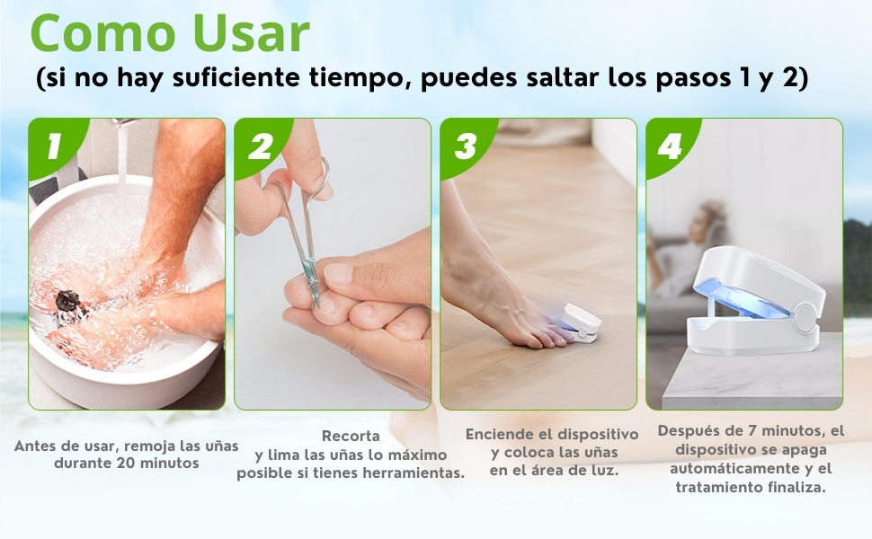- Fácil de usar: Coloca el dispositivo en la uña, 7 minutos de sesión y listo. Recomendado 2 veces al día.